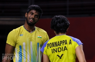 Next up on Court 2, it was a repeat of the last visit to Bangkok for India’s Ashwini Ponnappa and Satwiksairaj Rankireddy (pictured below). Rankireddy had already duplicated one of the upsets he enjoyed here in 2019 when he beat Choi/Seo in men’s doubles on Thursday. But for him and Ponnappa, their good fortunes began at the 2019 Thailand Open when they stunned the Olympic silver medallists in the opening round.