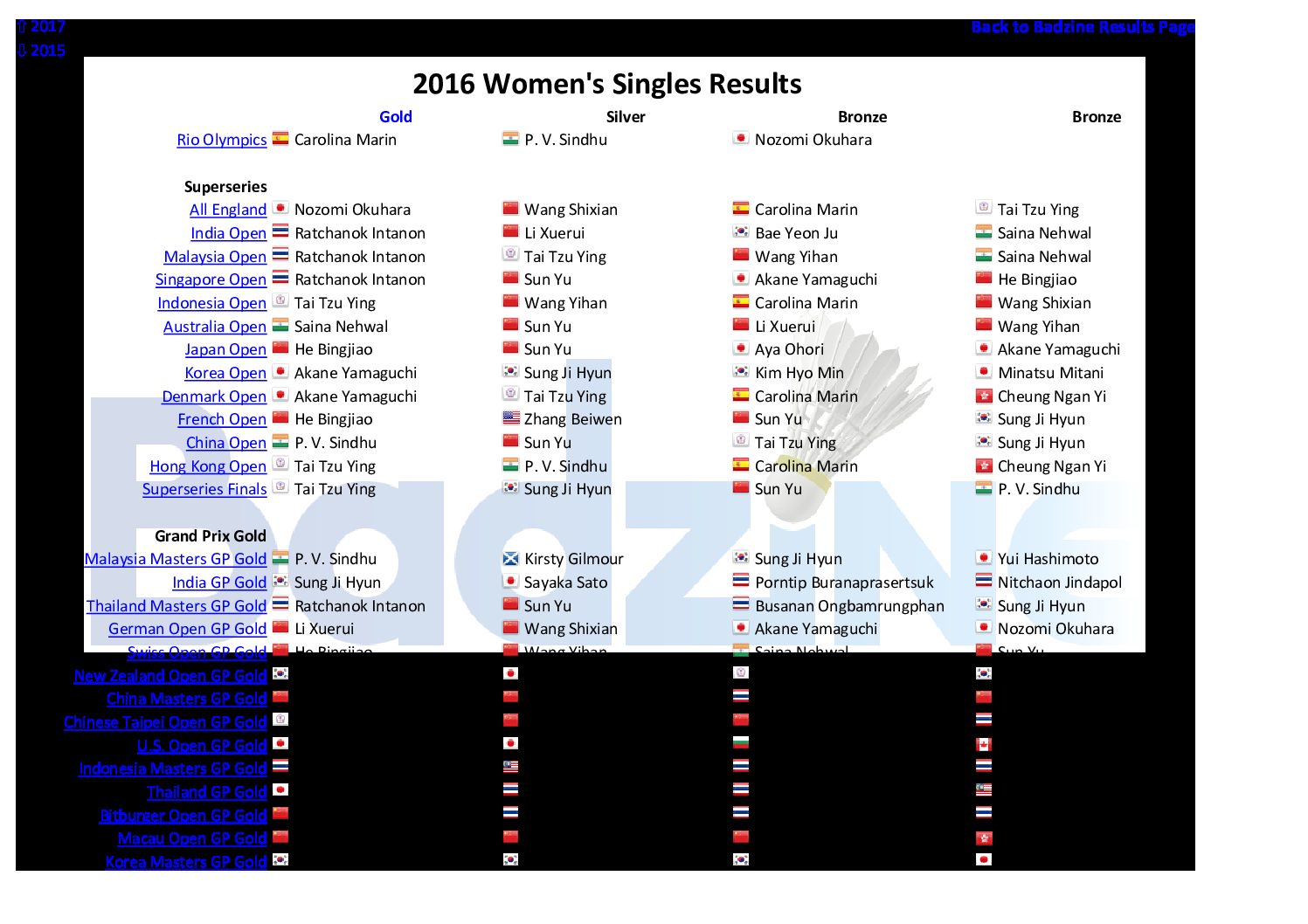 ![2016 Results ⇧ 2017 Results links ⇩ 2015 Results links Click here to see a table of major 2016 badminton event winners For 2016 major event medallists, click on the discipline below: […]](http://www.badzine.net/wp-content/uploads/2016-Results-WS-pdf.jpg)