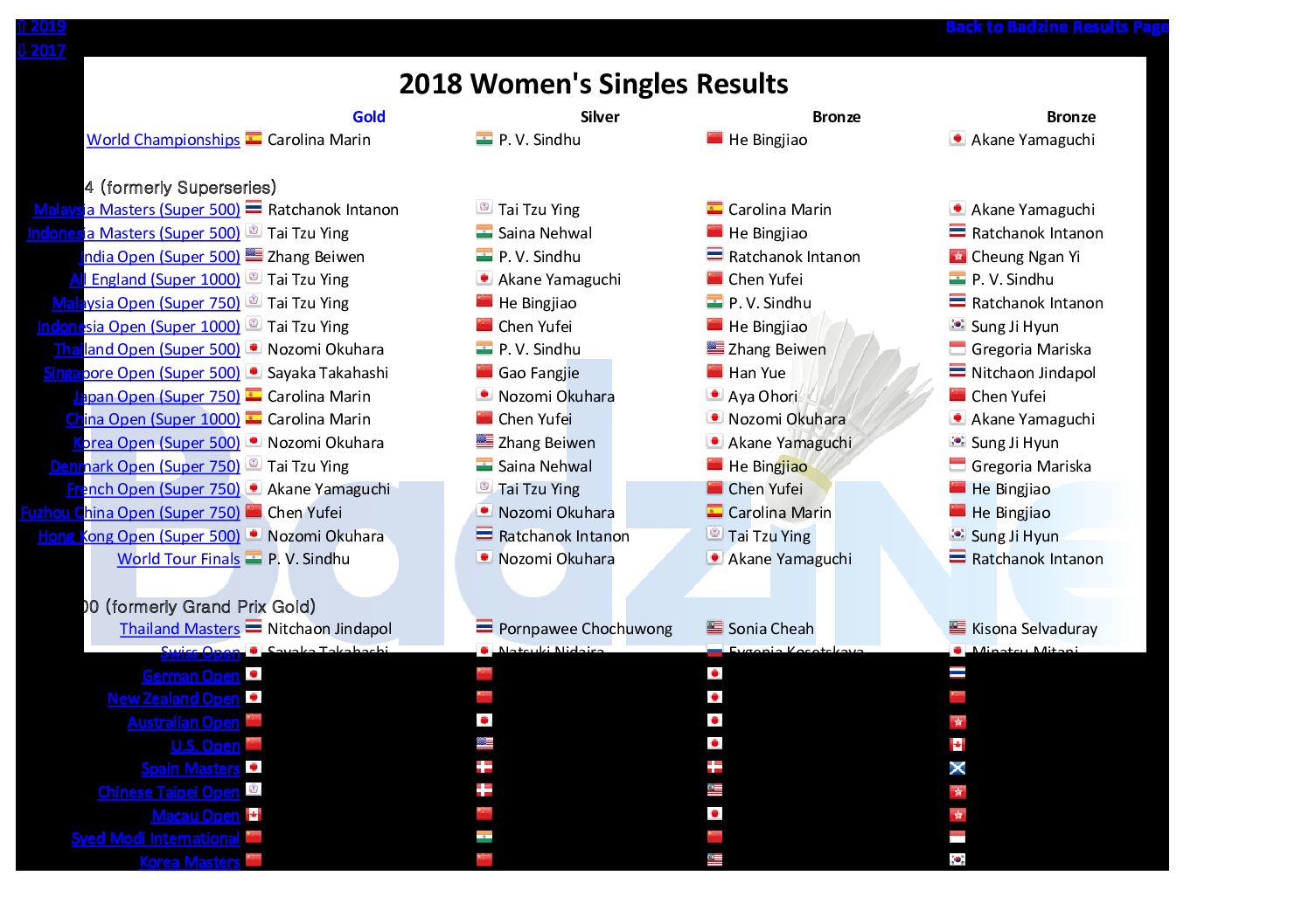 Posted on December 27, 2017 | No Comments⇧ 2019 Results links ⇩ 2017 Results links Click here to see a table of major 2018 badminton event winners For 2018 major event medallists, click on the discipline below: […] -