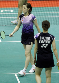 Jwala Gutta and Ashwini Ponnappa (pictured) provided their country with their first major upset of the day by dumping the world #6 duo of Miyuki Maeda and Satoko Suetsuna (pictured below) out of the tournament.