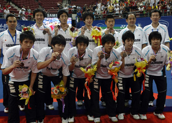 Shoji: I was surprised that we managed to reach the semi-final. I felt that previous Japanese teams were stronger than the current team. The previous team had many veteran members who had had good results like semi-final appreances at the World Championships, but the team hadn’t reached the semi-final stage. It was the first Thomas Cup for almost all players in our team. I didn’t reach final stage in my first Thomas Cup 2002. And I didn’t expect that I could get a medal on my 5th Thomas Cup!