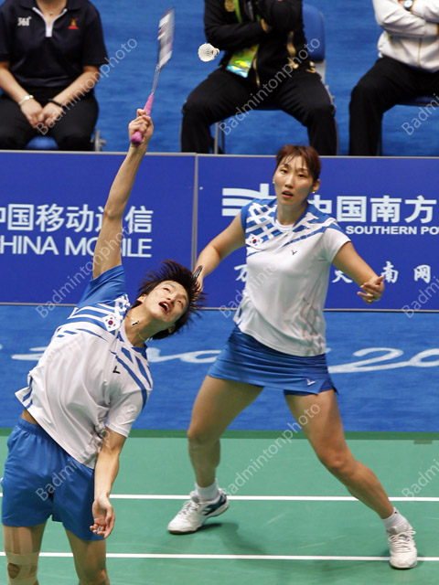 Lee Yong Dae’s elbow injury made at least one man happy. And maybe a whole nation, if, in Lee’s stead, Shin Baek Cheol and Lee Hyo Jung (photo) make it all the way to the gold medal. One step to go, as the “almost” scratch pair from Korea entered the final in the most appealing way on Saturday, wasting four match points to see He Hanbin and Ma Jin (photo) come back from 16-20 to 20-20 in the decider before the Koreans finally won the nail-biting tiebreaker and celebrated in the suddenly silenced hall.