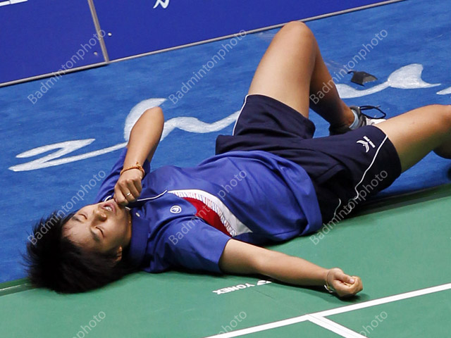 The first game was won 21-19 by Intanon, in a silent hall, but Wang Xin was to bank on her attacks to take control of the second and third game. Zhang Ning, her coach, had meticulously taken note throughout the first game and made sure the right tactics would apply from then on. In spite of some great shots from the Thai, Wang came on top 21-17, 21-14, showing signs of great relief when the final shuttle hit the ground.