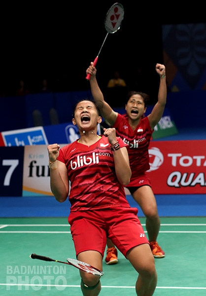 Vita Marissa and Hendra Aprida Gunawan (pictured below) were successful throughout the match at dropping the shuttle in front of the Korean defense but the Koreans tied it up at 18-all when Ko Sung Hyun dove for a drop at the front and Vita Marissa lifted the shuttle long at the back over Ha Jung Eun, who was at the moment left to defend all alone in mid-court. The Koreans still had to save one game point, though before pulling it out 22-20.