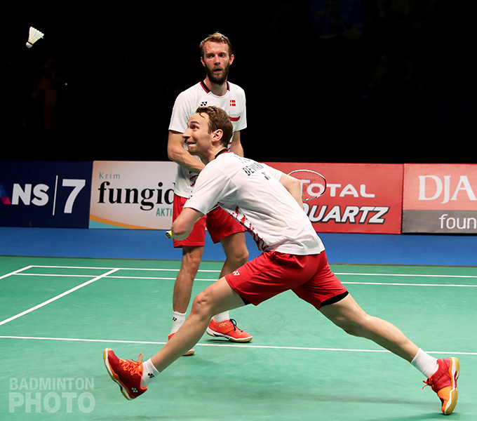 In the other half of the draw, Fischer-Nielsen and Pedersen were only able to barely keep pace tactically, with the Chinese Xu Chen and Ma Jin forcing Pedersen to the back. Even still, the Danes tenaciously attacked Ma Jin and any other gaps they could find. However, Ma Jin was able to direct the game play into their favour, taking the 1st game calmly 21-17. The Danes couldn’t do much about Xu Chen’s raw power, acrobatic moves, and Ma Jin’s superb coverage, watching helplessly as the match slipped away 8-21.