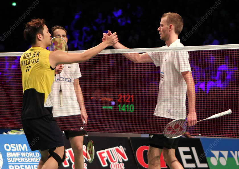 In a rare show of sportsmanship, when Cai dived unsuccessfully for a net shot in the 2nd game and went under the net, Yoo offered his hand to help Cai up, showing that badminton has always been, and is still a gentleman’s sport. Ko/Yoo stepped up their defense and court coverage, however, Fu, working in tandem with his quick partner Cai, smashed his way to a 21-14 win.