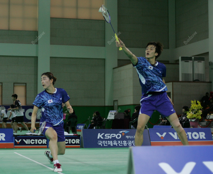 Eom Hye Won and Shin Baek Cheol (pictured) survived feisty Indonesian second seeds Irfan Fadhilah / Weni Anggraini, allowing them to get dangerously close before Fadhilah missed a diving attempt to retrieve a drop, slammed down his racquet, and earned a yellow card. The Koreans got the serve back and finished off the 19-21, 21-11, 21-18 victory.