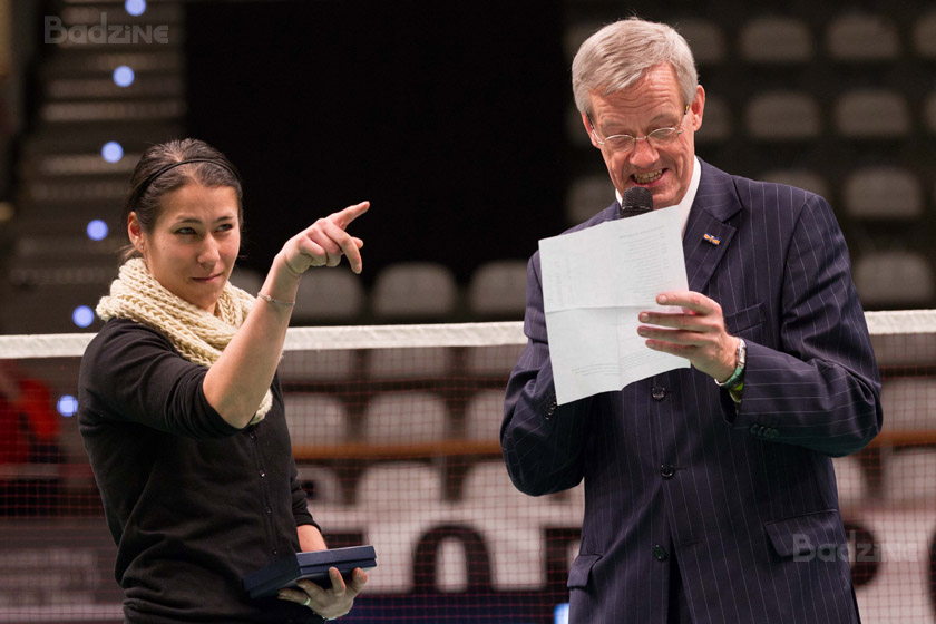 The noteworthy name missing from these national championships was that of Judith Meulendijks. Last Saturday, Judith received a warm goodbye from the Dutch home audience. From the chairman Clemens Wortel, she received an the award for “match achievements”, and her speech was greeted with a long round of applause. Wortels is shown below reading the long list of Meulendijks’s achievements.