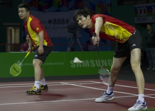 The Vietnamese did manage to win the mixed doubles tie with a surprise win by Duong Bao Duc / Thai Thi Hong Gan (pictured above) over India’s Tarun Kona / Ashwini Ponnappa, the pair’s only win so far aside from their drubbing of the Philippines. However, Bao Chunlai and Zheng Bo (pictured right) of China made light work of Huynh Nguyen Khang and Bao Minh to leave Vietnam all but mathematically eliminated from the semi-finals, essentially needing six shutouts to all them into the top four.