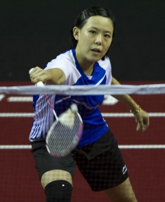The first match was between the up-and-coming Sonia Cheah, ranked 46th in the world, and Singapore Olympian Gu Juan (pictured below). This is the second match of the year between these two players after their match-up at the 2013 German Open, when Gu Juan won against Sonia in three games. This time around, Gu Juan showed that she still has the edge over Sonia with another rubber-game win 21-19, 15-21, 21-15.