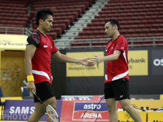Another seeded Malaysian pair, 3rd seeds Mohd Zakry Abdul Latif and Mohd Fairuzizuan Mohd Tazari fell to Indonesians Bona Septano and Afiat Yuris Wirawan (pictured). Even with Bona diving on the court many times to reach for almost impossible shots, Zakry and Fairuzizuan still could not find it in them to finish the points effectively and ceded the match.