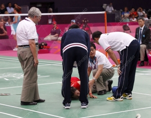 Sato (pictured right at the Olympics last year), who endured a nightmare the last time she played in London, retiring when 15-11 up against Tine Baun of Denmark, played with heavy strapping on her knee from the same injury. Fortunately, the result of this match was only reminiscent of that Olympic campaign in that Sato had trouble with a Scottish player and that she exited earlier than she’d hoped.