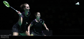 The first match of the evening session saw the Danes completed the set, progressing at every opportunity. Line Damkjær Kruse / Marie Roepke (pictured left) faced the winners of last night’s marathon match, the Singaporeans Shinta Mulia Sari / Yao Lei, who were obviously suffering from that match in the first game, as they went down quickly 11-21.