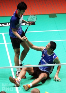 After the Germans edged a close first game 19-21, the Indonesians looked the stronger pair and took the next two games in double quick time, 21-13 21-11.