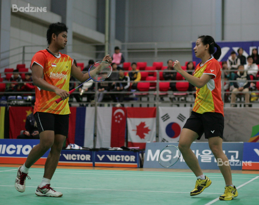 The afternoon in Jeonju opened with local boy Yoo Yeon Seong teamed up with Jang Ye Na in search of a third straight finals appearance. They were up against Indonesia’s Irfan Fadhilah / Weni Anggraini (pictured below), who had beaten Jang Ye Na and her temporary partner Shin Baek Cheol in the final of the Australian Open in April.