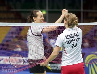 Fellow Belgian and sister, Lianne Tan, also came out on top after pushing herself through three games against Finland’s Nanna Vainio. The women’s singles saw most of the day’s three-game contests. The most notable was the battle between experienced players, Karin Schnaase (photo) of Germany and Russia’s Ella Diehl, in a match just shy of the 60-minute mark. Schnaase delivered a blow to the host country by winning 21-14, 18-21, 21-15.