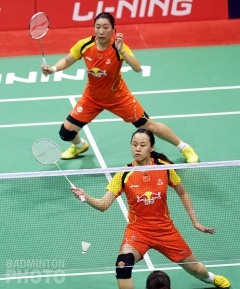 Something very similar to Lin Dan’s luck of the draw happens in women’s doubles, which also promises a pseudo-rematch of the 2014 final in Round 2. Utterly inexplicable is that the scratch pairing of world #2 and world #3 players haven’t been seeded, nor did they even make it to the main draw. Instead, unbelievably, they find themselves unseeded in the qualification round and, moreover, one of the pair is defending champ Zhao Yunlei. The most terrifying rear court women’s proponent, Wang Xiaoli (pictured above right), teams up with the smartest and most lethal front court player of the past five years, Zhao, to rival the current pair with by far the best head-to-head record against Chinese pairs, Danes Kamilla Rytter-Juhl / Christinna Pedersen.