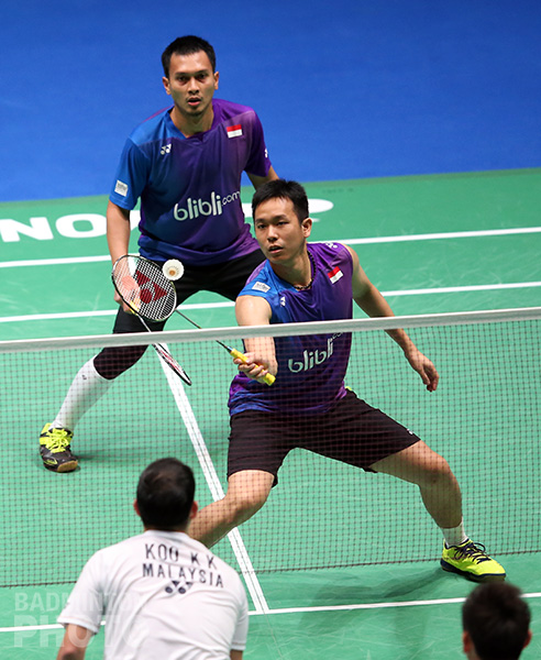 In the 2013 Australia Open, their only meeting since Hendra Setiawan began his partnership with Mohammad Ahsan (pictured), Koo/Tan had to admit the superiority of the soon-to-be World Champions. They lost in straight games in that quarter-final match but today in the All England, these veterans were finally able to even their head-to-head record.