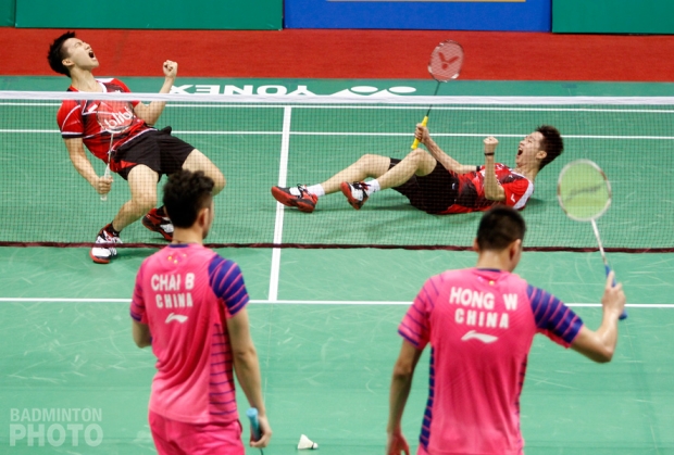 Men’s doubles is without its top seed as Marcus Fernaldi Gideon / Kevin Sanjaya Sukamuljo (pictured bottom) took out Chai Biao / Hong Wei in three close games. The quarter-finals features three pairs of pairs who are jockeying for position in the Rio race. Gideon and Sukamuljo may be too far outside the top 8 to have a chance but Ko/Shin and Kim/Kim of Korea are still duelling to be the second Korean pair while Chen/Wang still have a chance of reeling in Lee/Tsai to become Chinese Taipei’s Olympic pair.