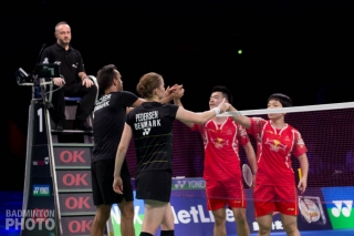 Chen seemed to have an edge on Pedersen at the net early in the match but Fischer Nielsen began to have success rushing to the net to drive the shuttle down and the Chinese pair just couldn’t keep on the attack often enough to stay on top.