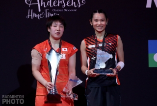 For his part, Son Wan Ho (pictured top, with Saensomboonsuk) seemed hesitant in the backcourt, often playing lifts very late after prevaricating about whether they were in or out. He almost seemed to resemble his semi-final opponent by getting to the back and choosing not to attack, but he wasn’t able to keep his Thai challenger guessing with the shots he did select. His net play was sound but Saensomboonsuk was able to at least match the Korean and he seemed able to make every attacking opportunity count.