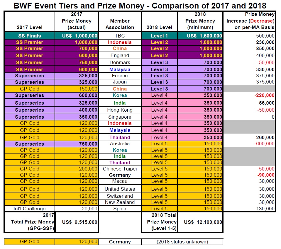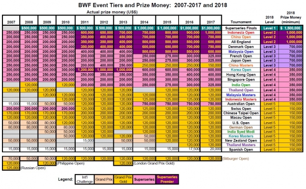 The new structure for 2018 to 2021, unveiled by the BWF on the weekend, includes 27 tournaments in total. The 2017 season also has 27 tournaments – if we count the Grand Prix Gold and the Superseries, Superseries Premier, and Superseries Finals – but from 2018, the 27 are to be divided into 5 tiers instead of 4. The total prize money for these top echelons is expected to go up by nearly 30%, from US$9.5 million to just over $12 million. Most of this increase comes from the new ‘Level 3’, which could be thought of as a sort of 2nd tier Superseries Premier, except that its purses exceed the current Premier minimum.