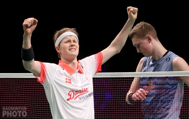 Anders Antonsen stunned defending champion Viktor Axelsen, while Rajiv Ouseph saved two match points to set up an unexpected men’s singles final at the 2017 European Badminton Championships.