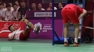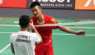 Still, Shi Yuqi, who appeared as the opening act, encountered difficulties when facing Anthony Sinisuka Ginting (pictured). Supported by thousands of host supporters, Ginting actually won the first game 21-14. But a foot injury forced the 22-year-old to give up at the end of the 3rd game when he was definitly still within striking distance, trailing Shi only 20-21.