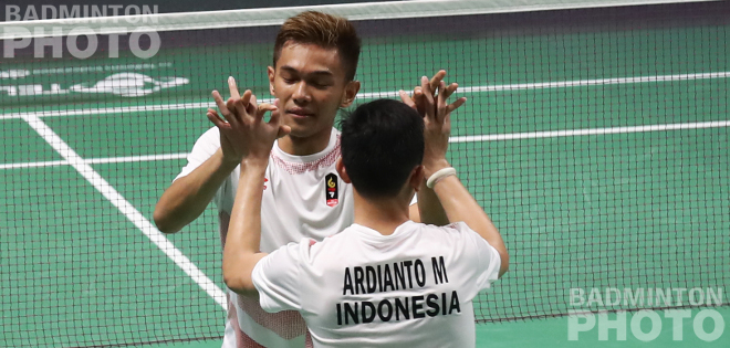First came the upset. Fajar Alfian / Muhammad Rian Ardianto (pictured right) qualified after winning the match against newly crowned World Champions Li Jinhui / Liu Yuchen, 21-14, 19-21, 21-13.