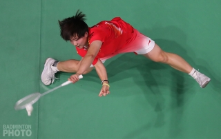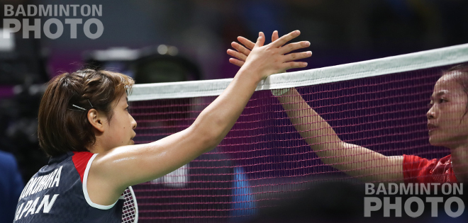 Despite Yamaguchi’s loss, her world #1 team-mates Yuki Fukushima and Sayaka Hirota managed to win, as did Nozomi Okuhara (pictured top, with opponent Fitriani), and reverse the situation to 2-1.