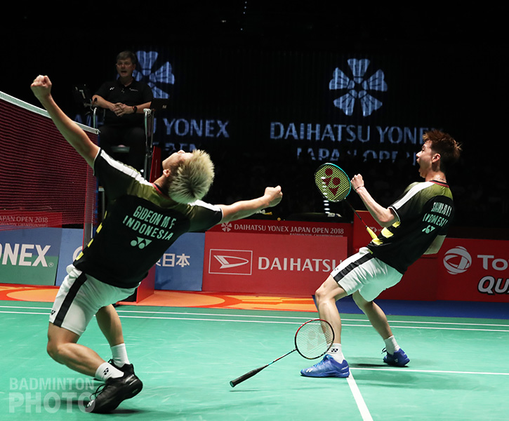 MD: Marcus Fernaldi Gideon / Kevin Sanjaya Sukamuljo (INA) [1] beat Li Junhui / Liu Yuchen (CHN) [2] 21-11, 21-13