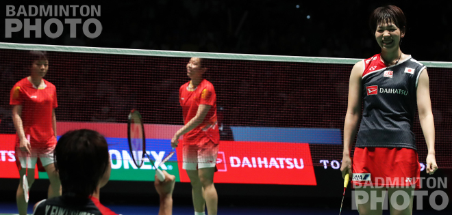 WD: Yuki Fukushima / Sayaka Hirota (JPN) [1] beat Chen Qingchen / Jia Yifan (CHN) [3] 21-15, 21-12