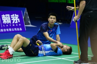 With both Malaysians diving to the corner in an unsuccessful attempt to retrieve a deep push by Takeshi Kamura, Teo Ee Yi (pictured top) was caught in the chin by Ong’s foot and lay flat on his back bleeding as medical personnel rushed in to administer bandages. It was 8 more minutes before play resumed with Teo sporting substantial bandaging on his chin.