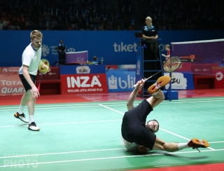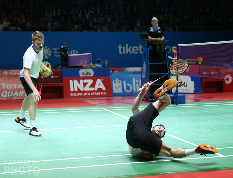 Meanwhile, the 4th seeded men’s doubles pair Hendra Setiawan / Mohammad Ahsan managed to win an exciting fight against England’s Marcus Ellis / Chris Langridge (pictured right). Even though the 2013 champions recorded their victory in two straight games, the senior pair had to sweat for 51 minutes to finish the game with a score of 28-26, 21-17.