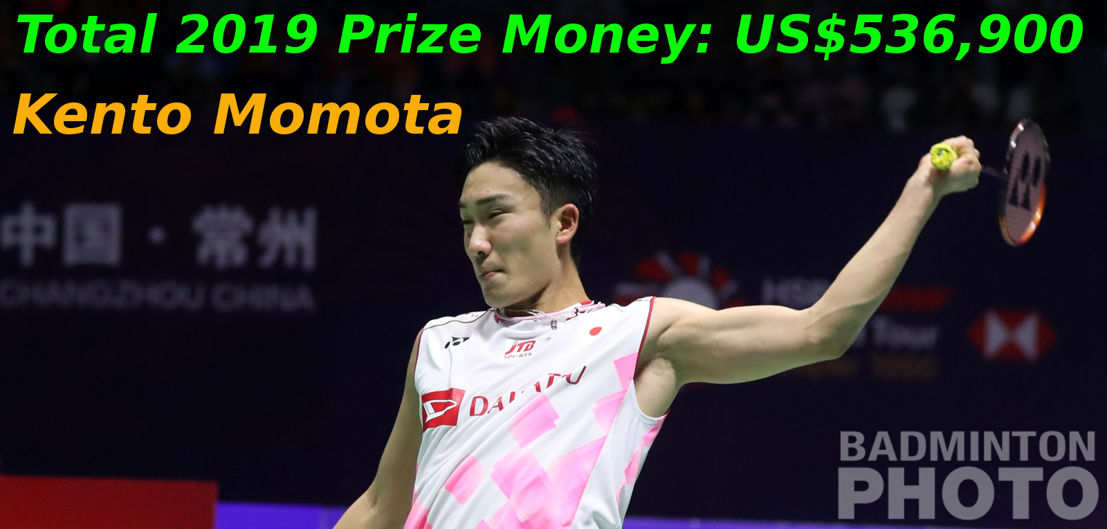 World #1 Kento Momota became the first badminton player in history to earn more than half a million dollars in prize money when he tacked on $120,000 from the World Tour Finals on Sunday.