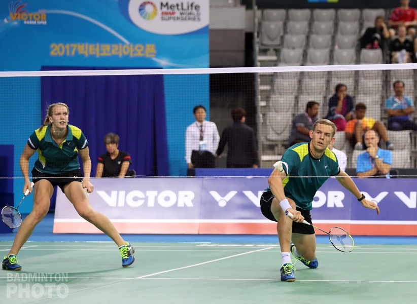 Koreans Kim Sa Rang and Kim Ha Na (pictured above) started off finals day but bouncing back from one game down to beat Thom Gicquel / Delphine Delrue in three. The French pair had a dominant attacking game in the opener but the Koreans kept it flat in the next two, continually forcing the Europeans to take the shuttle from below the tape. Kim Ha Na spent ample time in the backcourt, as Sa Rang repeatedly took his turn rushing to put pressure at the net.
