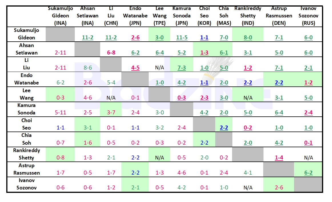 Click on the above table to see a version with links to detailed head-to-head results. Cels shaded in green denote match-ups that will take place in the round robin stage.