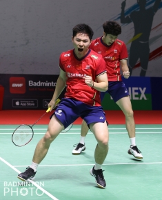 He and Zhou advance to the semis to take on Fajar Alfian / Muhammad Rian Ardianto (pictured bottom), who beat Olympic champions Wang/Lee.