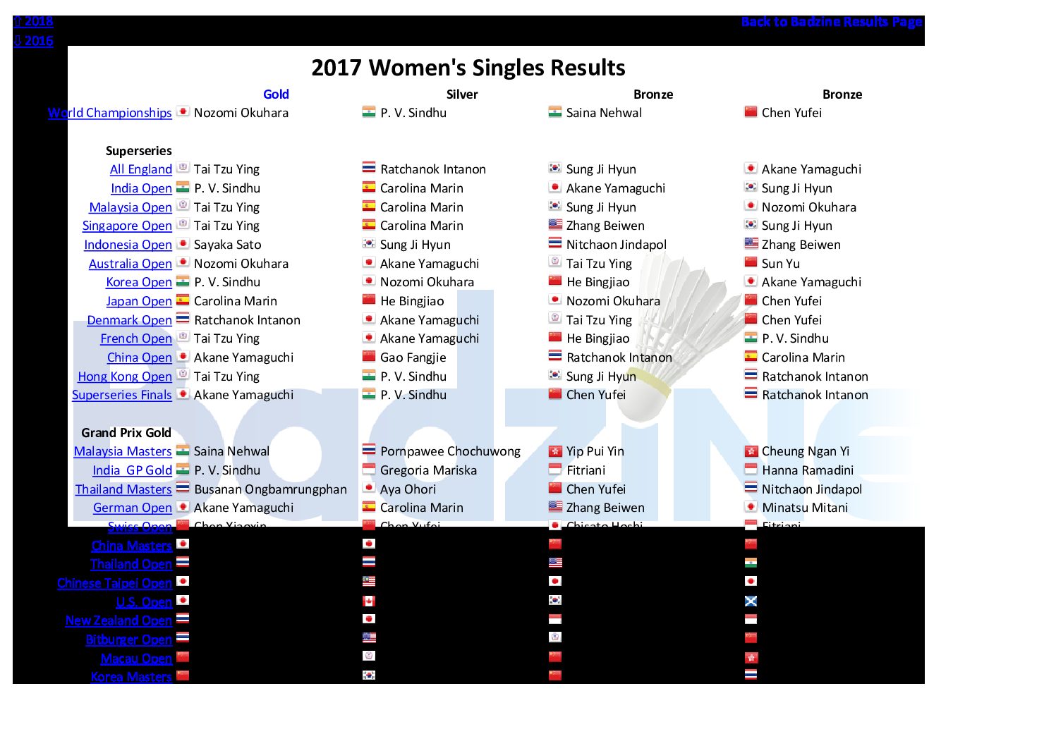 ![2017 Results ⇧ 2018 Results links ⇩ 2016 Results links Click here to see a table of major 2017 badminton event winners For 2017 major event medallists, click on the discipline below: […]](http://www.badzine.net/wp-content/uploads/2017-Results-WS-pdf.jpg)