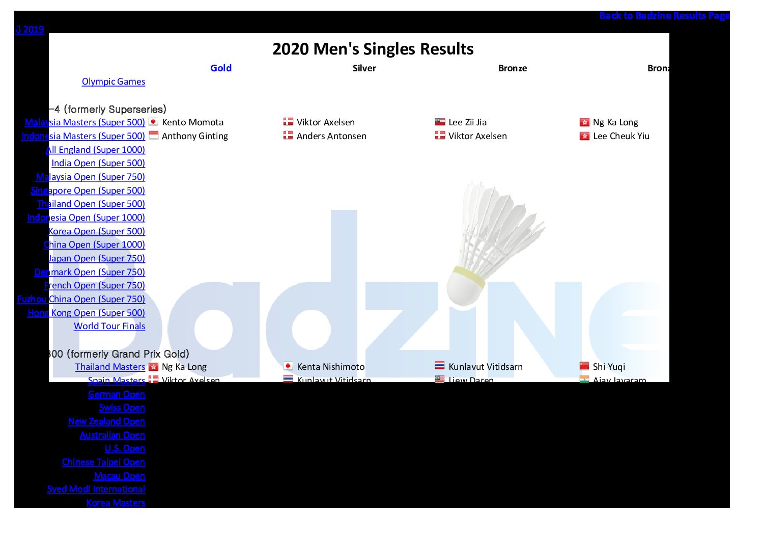 ![2020 Results ⇧ 2021 Results links ⇩ 2019 Results links Click here to see a table of major 2020 badminton event winners For 2020 major event medallists, click on the discipline below: […]](https://www.badzine.net/wp-content/uploads/2020-Results-MS-pdf.jpg)